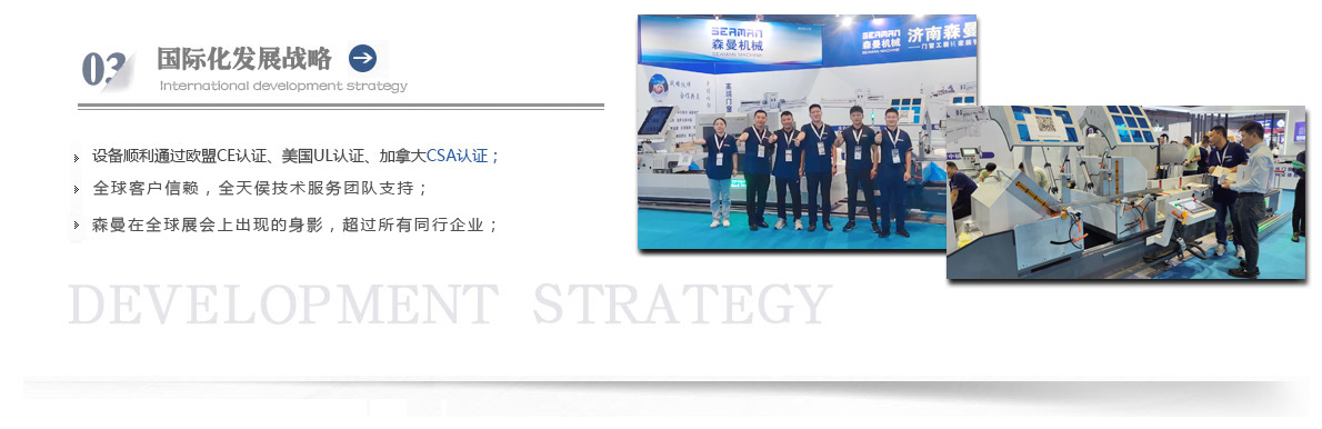 “森曼機械”作為全球門窗設(shè)備供應(yīng)商,本著"seaman"精神,勇立潮頭,拼搏創(chuàng)新,以爭做行業(yè)為目標(biāo),在行業(yè)前輩發(fā)展的基礎(chǔ)上,努力學(xué)習(xí),積極進(jìn)取。目前公司產(chǎn)品涵蓋塑料門窗設(shè)備、鋁合金門窗設(shè)備、鋁幕墻設(shè)備、鋁木復(fù)合門窗設(shè)備及中空玻璃設(shè)備五大種類,近百個品種。公司產(chǎn)品銷售至全國各地及東南亞、非洲、東歐、北美等幾十個國家和地區(qū)。在這個競爭激烈的年代,我們正努力使我們的產(chǎn)品!